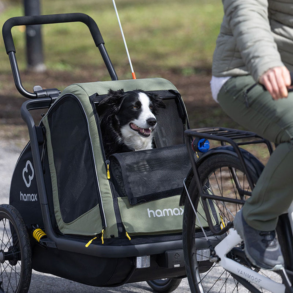 Dank des Buggy-Kits kann der Hund bei verschiedenen Outdoor-Aktivitäten dabei sein.
